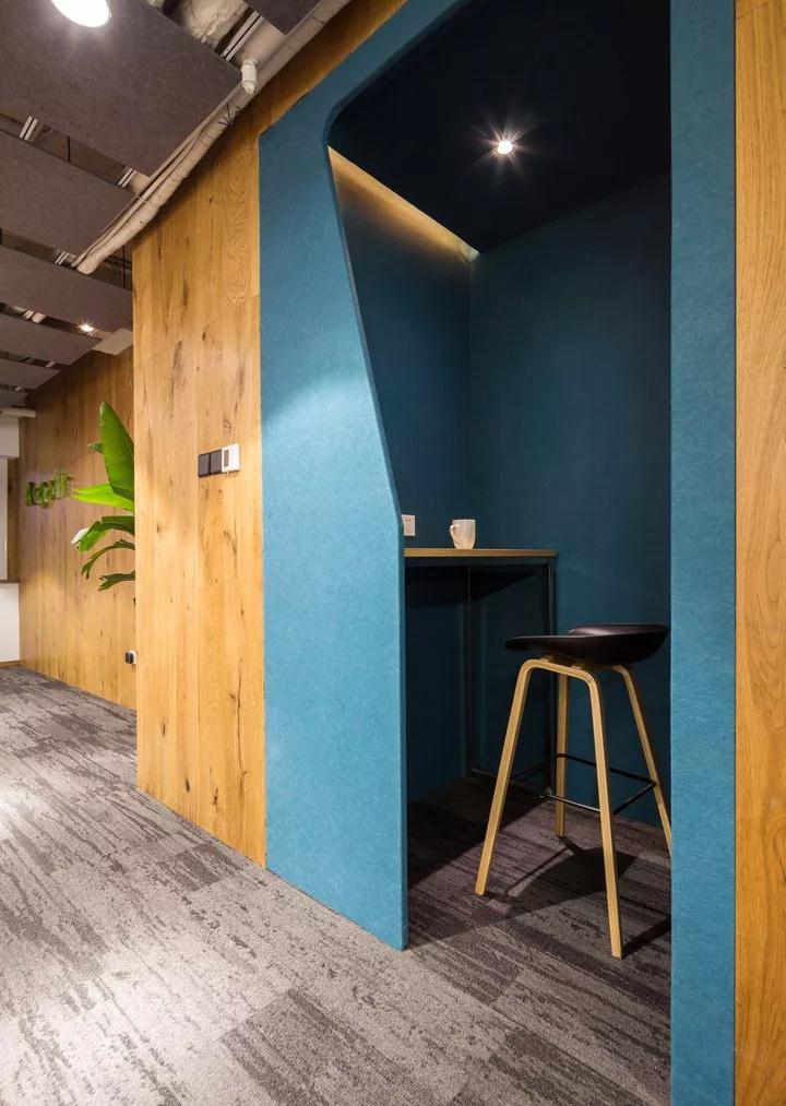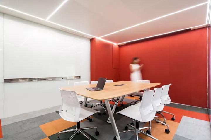 會議室使用了紅色毛氈、白色烤漆玻璃涂寫墻、方塊組合地毯,與白色座椅形成對比。水吧區(qū)設(shè)有卡座式座位,滿足員工之間交流與討論,體現(xiàn)了公司文化和協(xié)作精神。帶有穿孔的毛氈掛板,深圳裝修公司設(shè)計(jì)師自己動手制作的紅色毛氈燈具、皮革與毛氈結(jié)合的隔斷,起到很好的吸音與隔離的效果,通過色彩、家具、手工制品,展示了一個(gè)充滿活力、色彩豐富的辦公空間。