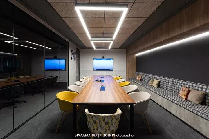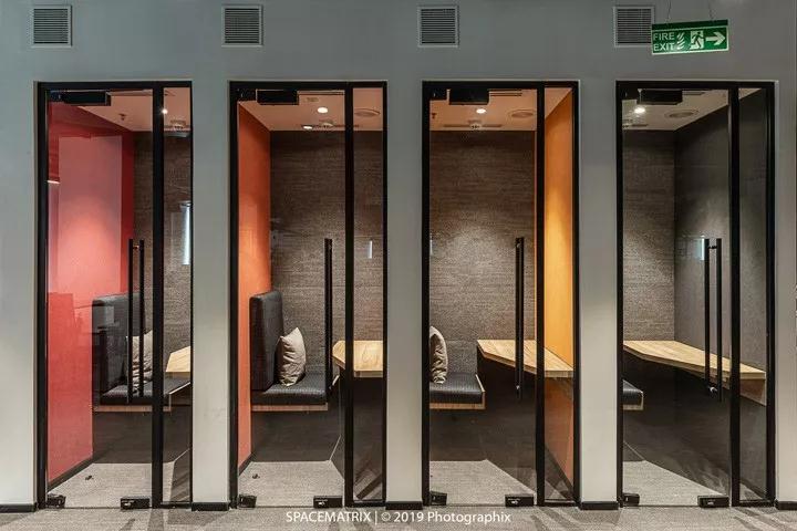 在熟悉了員工的工作方式后,裝修設計團隊將六種不同形式的會議空間納入到本案的設計中:電話亭、車廂座會議艙、階梯座位、頭腦風暴區(qū)和非正式/正式會議區(qū)。