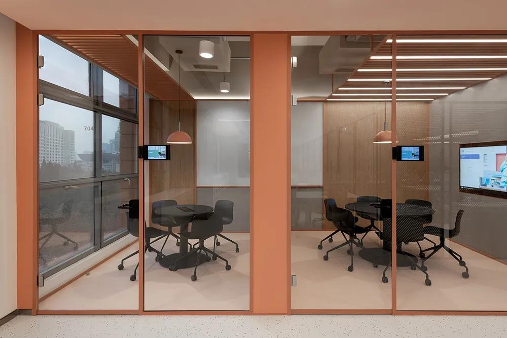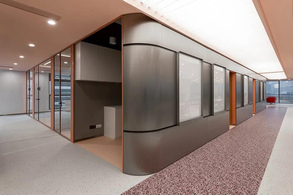 打造全新的辦公裝修空間。雙方合作設計,傳遞前沿時尚態(tài)度,定義未來科技驅(qū)動的辦公方式,整體設計是一個線性空間,三邊由高玻璃隔開包裹。深圳裝飾公司形成了秩序井然、合作便捷的辦公氛圍。設計試圖在一系列弧度和曲面的表現(xiàn)與工業(yè)風格的硬朗質(zhì)感之間創(chuàng)造一種平衡感。中央走道的設計實現(xiàn)了迎賓和引導視線沿空間延伸的雙重功能。天花板是長條形拉伸膜光幕,外部裝飾有一層玻璃網(wǎng)格,與深紅色橢圓形乙烯基底座裝飾相反。深圳裝飾公司拉絲不銹鋼墻板外嵌有滑動白板和留言板,方便辦公室裝修設計過程中的合作。靠近入口的三間會客室和前臺均采用漸變長虹玻璃,顏色由粉色過渡到透明。會議室的墻壁是柔和的粉紅色,深圳裝飾公司嵌入了不對稱裝飾板,天花板是橢圓形透明膜,地面是深藍色的德嘉地板。接待區(qū)和辦公區(qū)由弧形黑框不銹鋼穿孔板屏風隔開。屏幕鏤空圖案的大小由下至上逐漸設計,既保護隱私又保證視野內(nèi)的廣闊視野,空間四周環(huán)繞著會議室、印刷室、茶室和一些安靜的角落,周圍環(huán)繞著珊瑚色的金屬屏風。